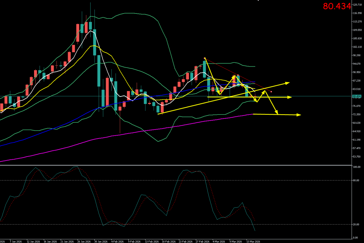 本周一(3月16日)亚市早盘至午盘,银价延续弱势下行格局,盘中一度失守80美元整数关口。现货白银交投于80.58美元/盎司附近。日内最高触及80.98美元/盎司上方,最低回踩至78.35美元/盎司一线,创近两周新低。盘面呈现典型的“破位后加速探底”特征,市场情绪极度悲观。