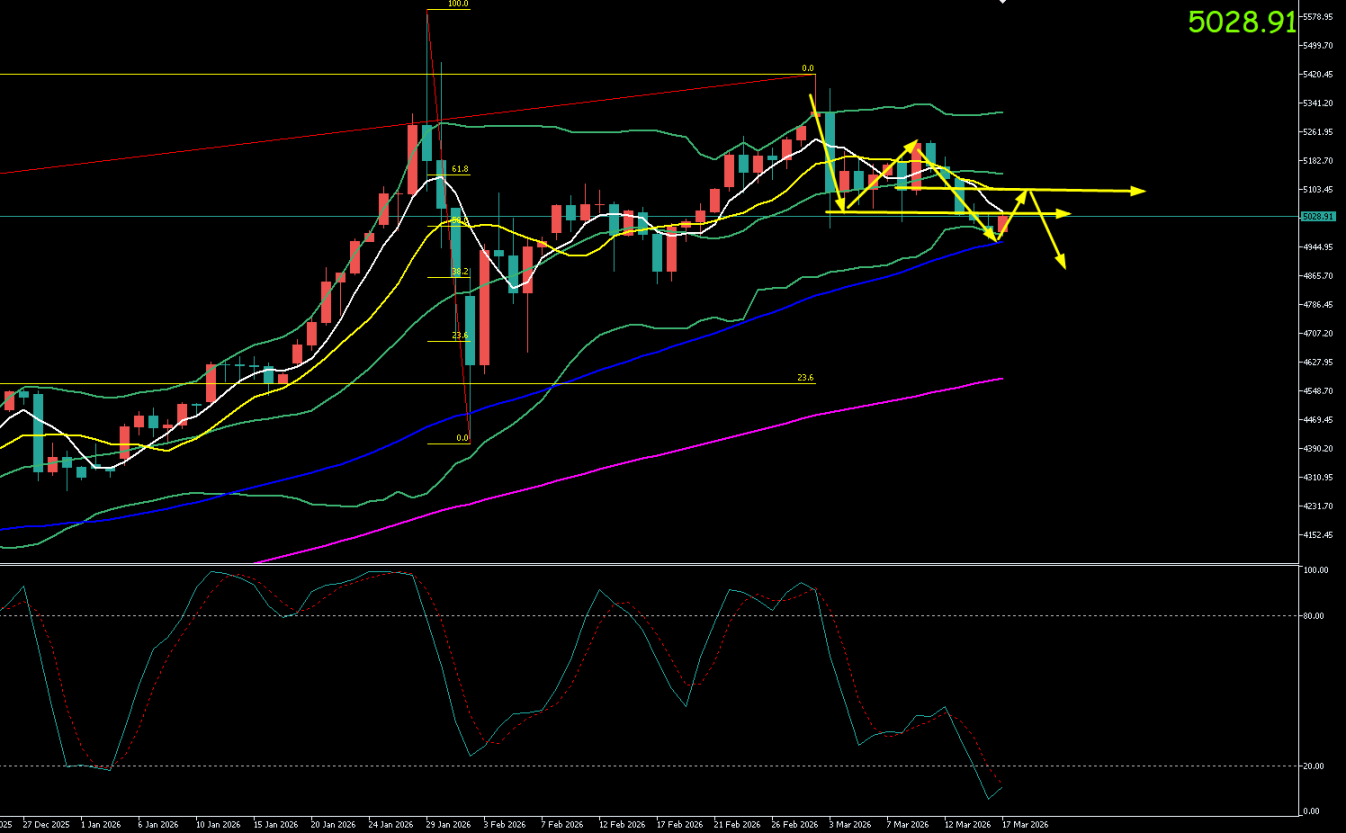 周一(3月16日),现货黄金在多重利空压制下围绕5000美元关口激烈争夺,整体维持弱势震荡格局。价格开盘于5002.93美元/盎司,亚欧盘时段受5030美元附近压制明显,盘中最高触及5038.94美元/盎司,纽约时段抛压持续,最低下探至4969.92美元/盎司,最终收盘于5005.91美元/盎司附近。日线收出一根十字星阴线,单日跌幅0.26%,显示多空双方在5000关口势均力敌。