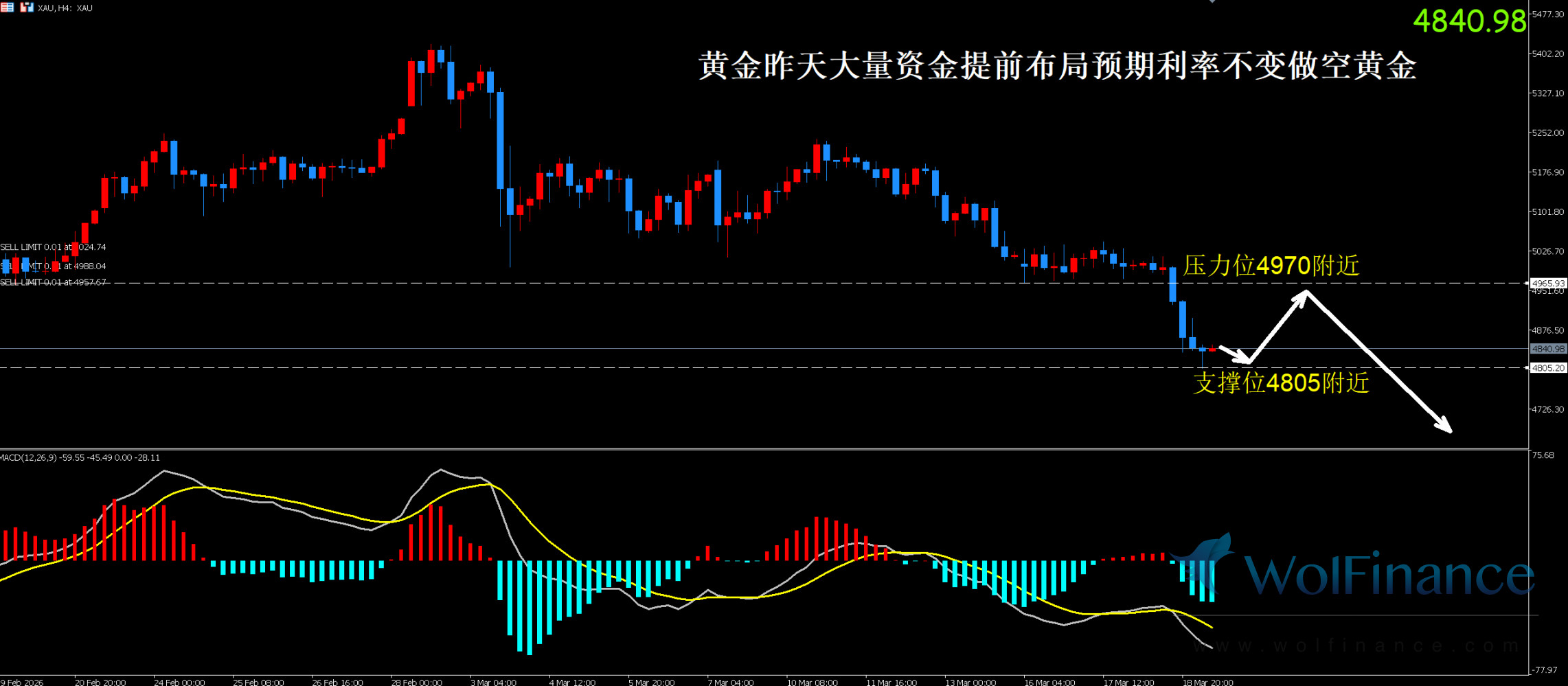 周四(03 月 19 日)黄金早盘延续美盘跌势,当前价格报 4840.98 附近,日内跌幅进一步扩大,核心源于美联储 3 月利率决议已落地并释放明确偏鹰信号,市场提前在美盘前完成预期计价,导致金价大幅下挫。昨天欧盘本人在直播分析中,观点明确到1.金价多单很弱,区间震荡跌破答复做空,2.同时市场进行区间下方挂4973的跌破空,3.同时直播结束前明确追空观点。4.周二对利率决议不变利空金银也做了分析,请大家多关注我的文章分析,会尽心发现金银市场行情细微线索,分析行情预期判断。