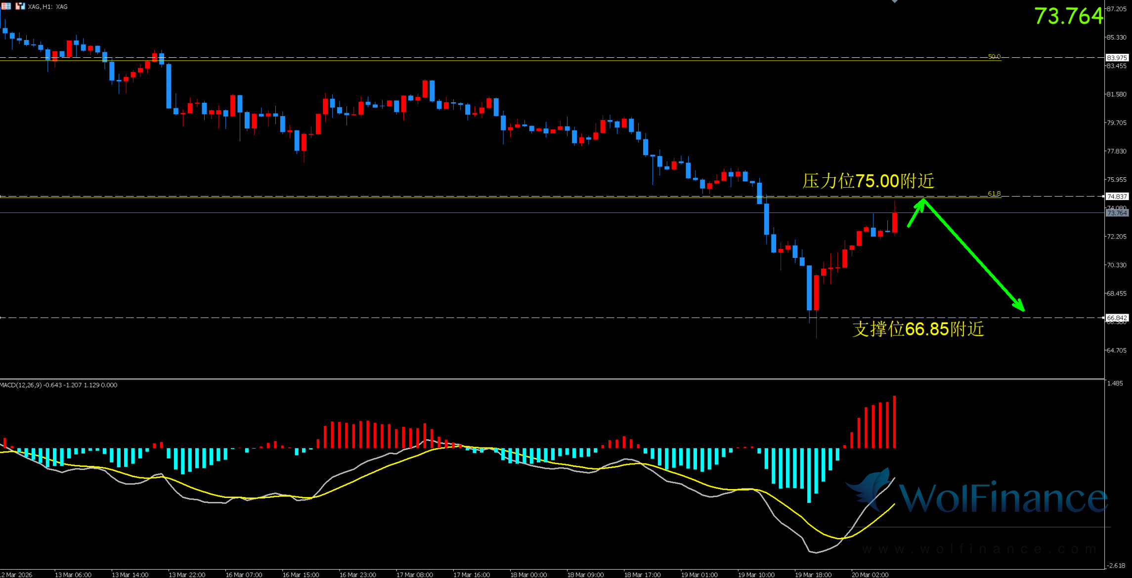 白银 1 小时技术图表显示当前价格处于低位反弹阶段,上方 75.00 附近为短期强阻力,反弹至此承压概率极高;