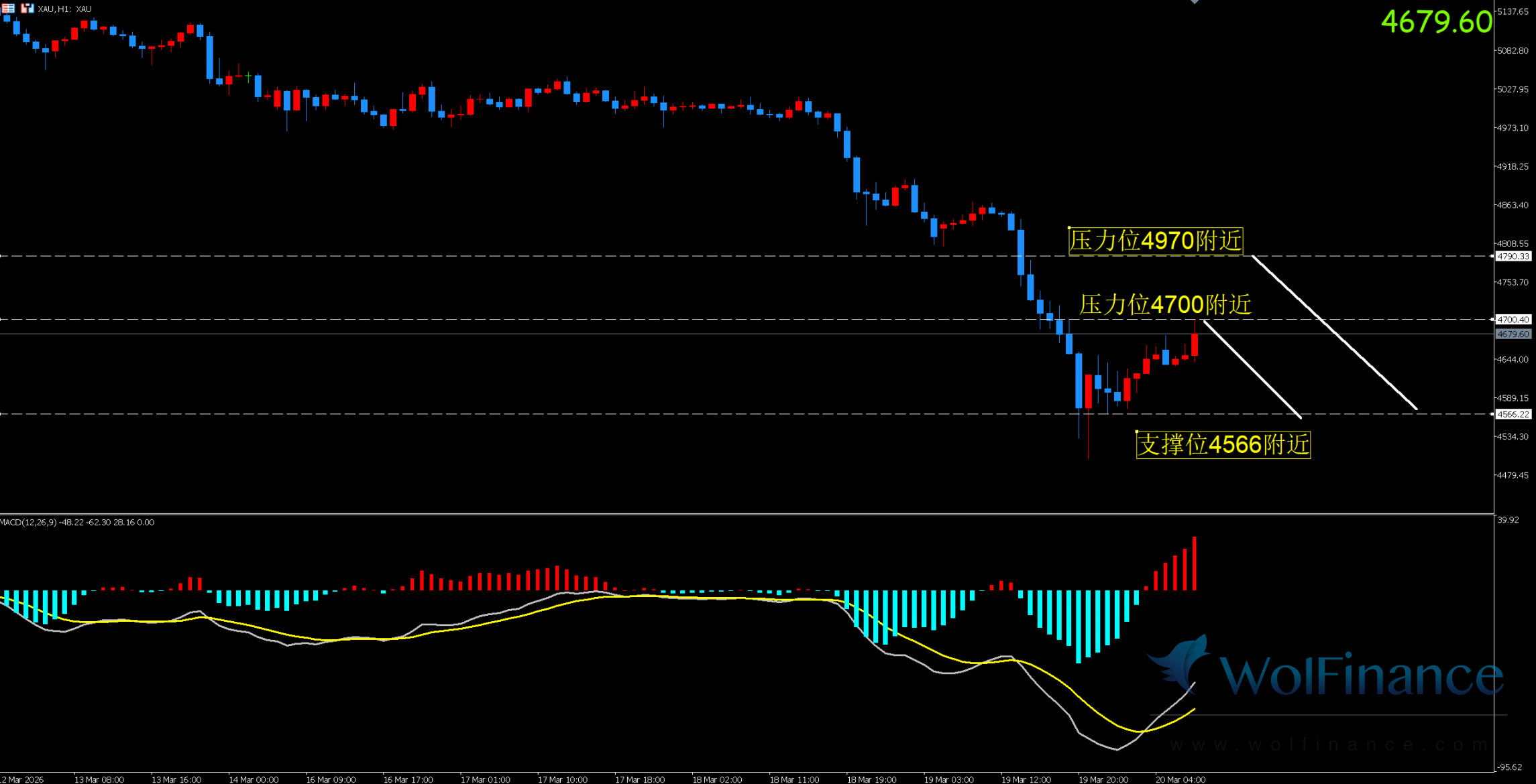 下方关键支撑位 4566 附近,若失守则打开进一步下行空间,下看 4500-4480 区间;