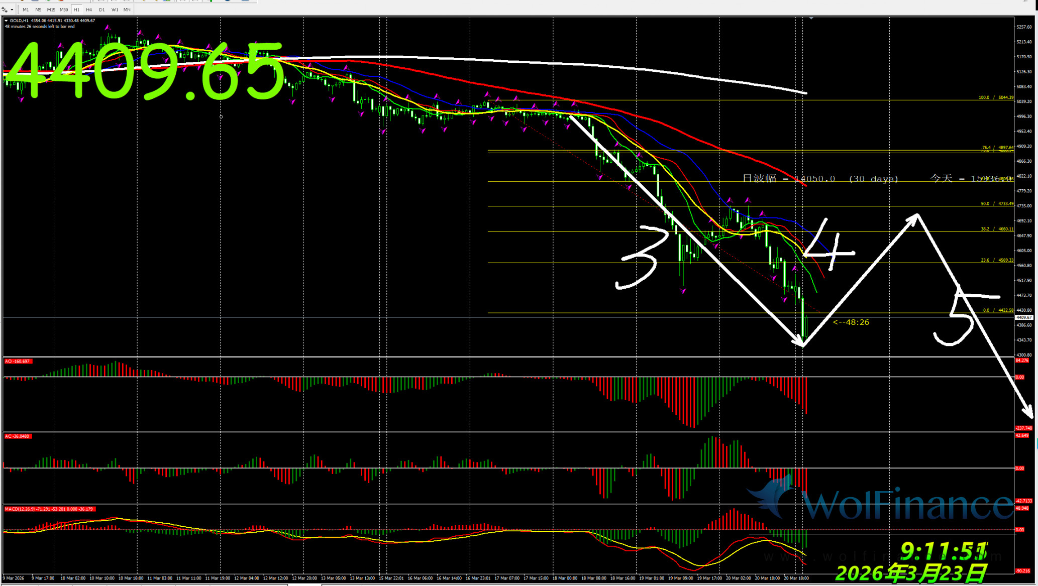 日线级别行情处于4浪行情,关注4浪行情走势,在日线图中关注压力倾向在日线图5100一线附近;支撑倾向在日线图50%(4743);61.8%(4541);四小时行情处于3浪状态,关注3浪的行情走势。支撑倾向在4300附近。1小时图AO零轴下红色,AC零轴下红色,代表在小时图中,行情倾向隔夜小时图处在3浪行情,目前在小时图中关注3浪的行情走势,下方支撑4300附近。在1小时图中,行情上涨压力关注5100附近。