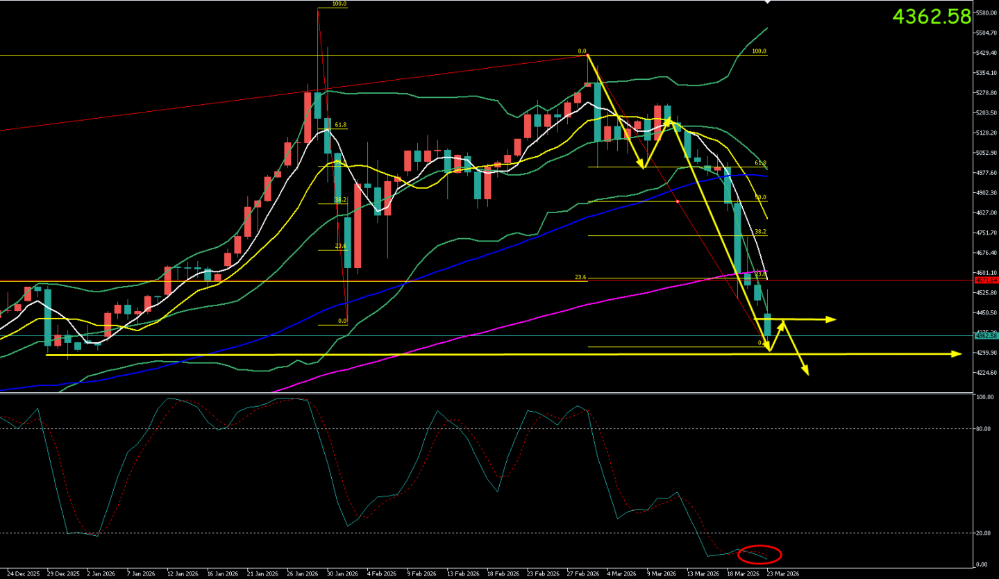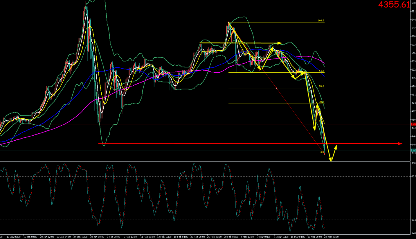 本周一(3月23日)亚市早盘至午盘,金价开盘后遭遇恐慌性抛售,4400美元整数关口宣告失守。现货黄金交投于4356美元/盎司附近。日内最高触及4536.37美元/盎司上方,最低下探至4319美元/盎司一线,创2月5日以来新低。盘面呈现典型的“破位加速探底”特征,市场情绪极度悲观。