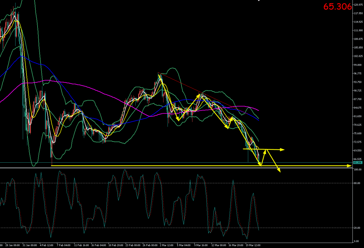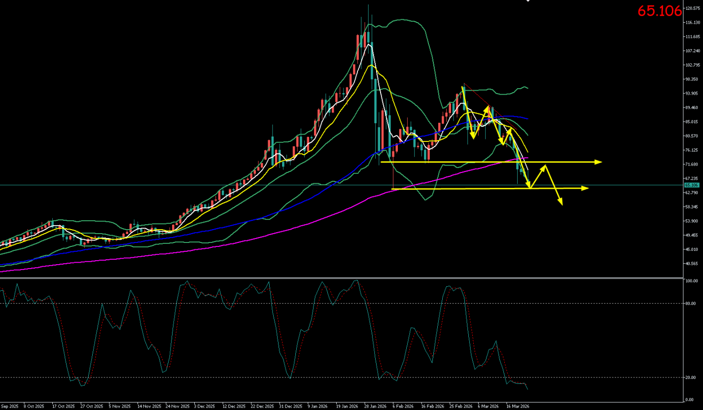 本周一(3月23日)亚市早盘至午盘,银价开盘后遭遇恐慌性抛售,65美元整数关口宣告失守。现货白银交投于65.07美元/盎司附近。日内最高触及69.6美元/盎司上方,最低下探至64.10美元/盎司一线,创2月5日以来新低。盘面呈现典型的“破位加速探底”特征,市场情绪极度悲观。